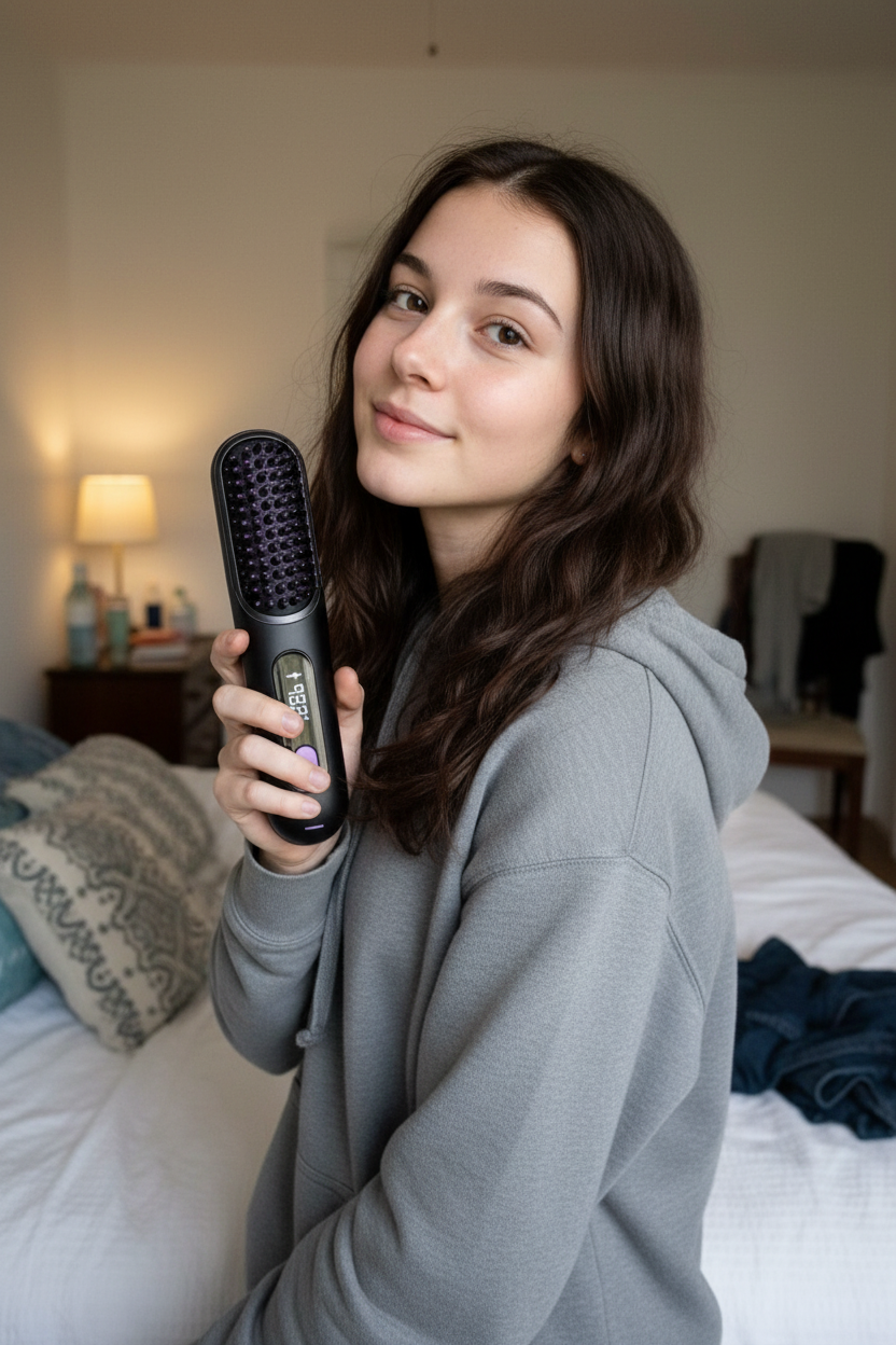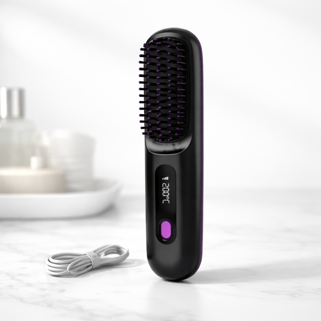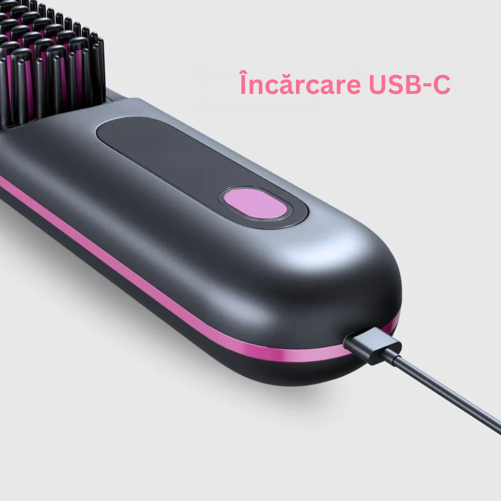 La control, este văzută ca un aparat de coafat fără fir, similar cu o periuță de dinți electrică.