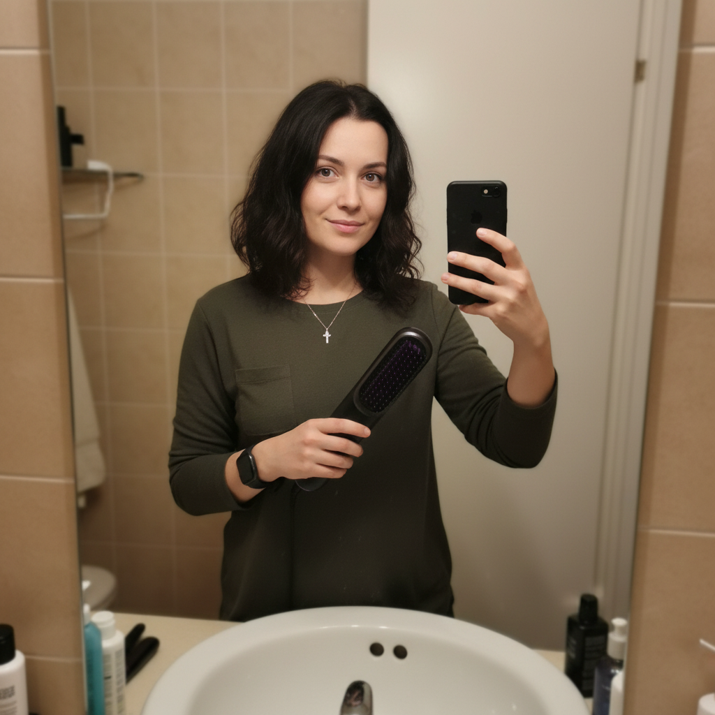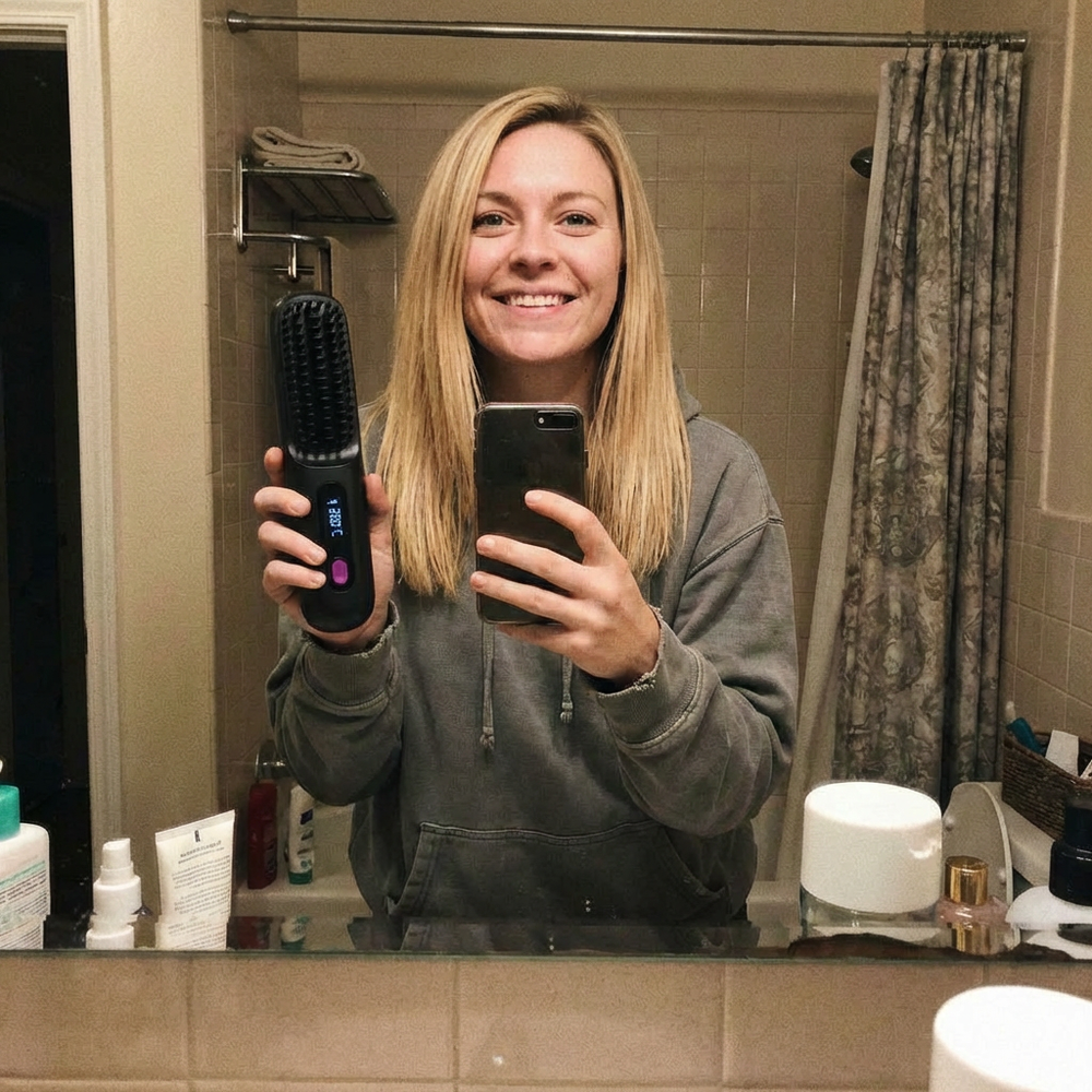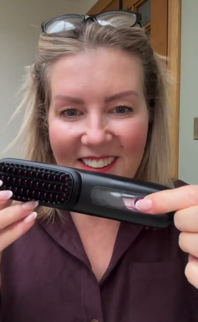 La control, este văzută ca un aparat de coafat fără fir, similar cu o periuță de dinți electrică.